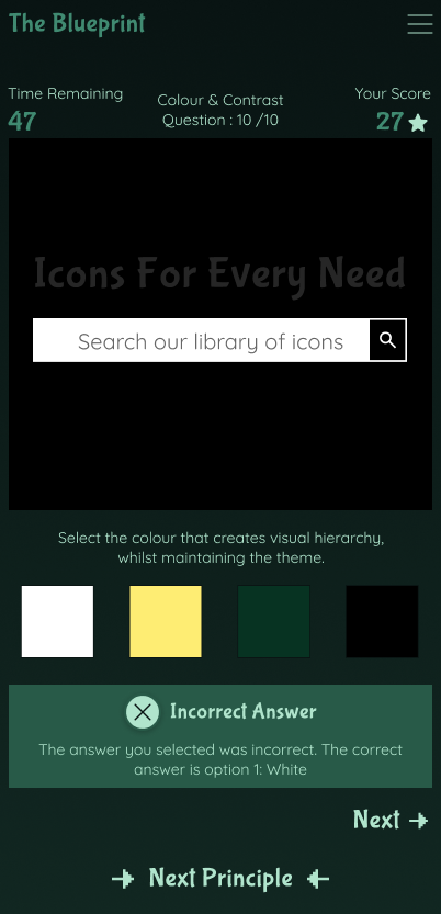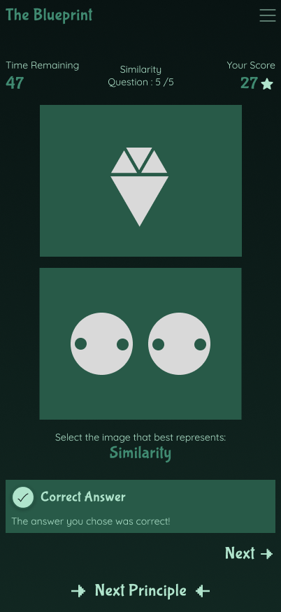 The goal of The Blueprint was to explore an alternative approach by shifting learning from passive consumption to active participation. By introducing short, focused challenges, users are encouraged to apply design principles in real-time rather than simply observing them. This approach leverages interaction as a learning tool, helping users build stronger mental associations and improve recall.