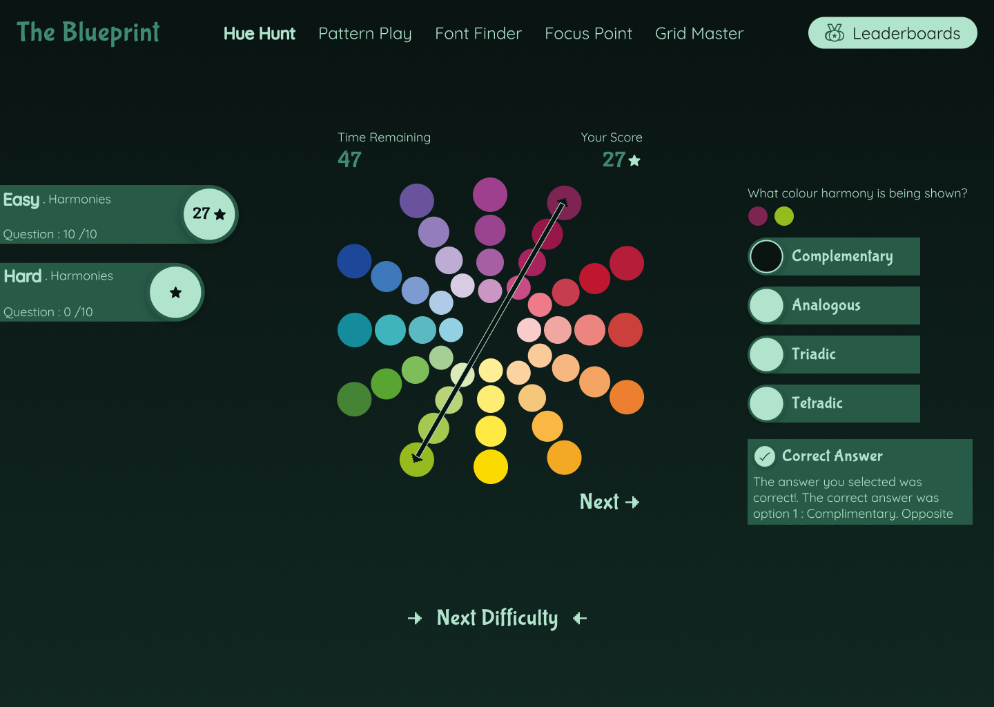 Focuses on colour matching, harmonies, and mixing. These challenges help users understand how colours interact, how to create balance, and how to use colour intentionally within an interface.