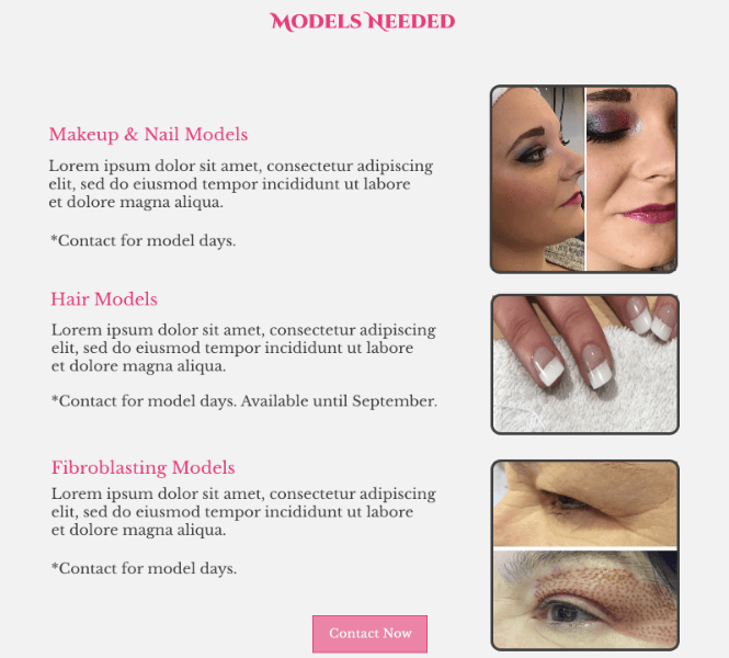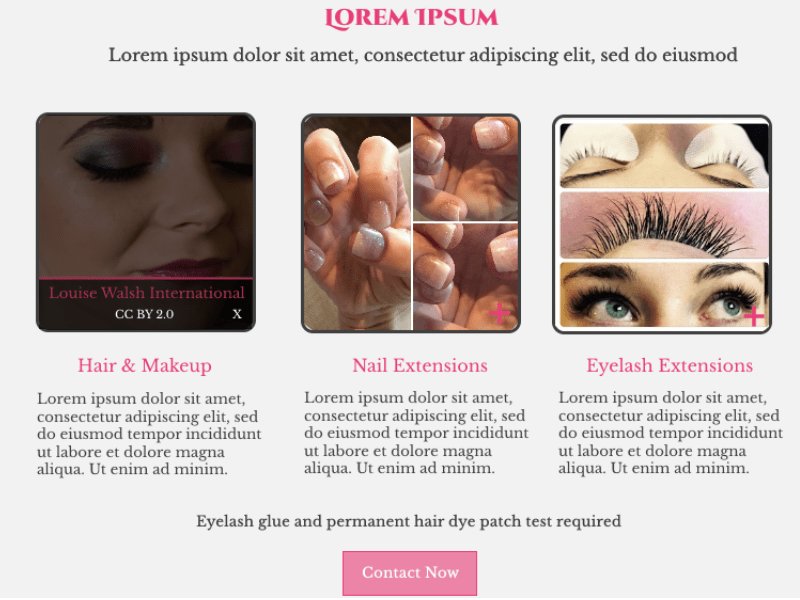 Pink was selected as the primary accent colour due to its strong association with glamour and beauty—key qualities the brand wanted to convey. It was paired with a light grey background to create contrast and allow the accent colour to clearly guide attention toward important sections and calls to action.