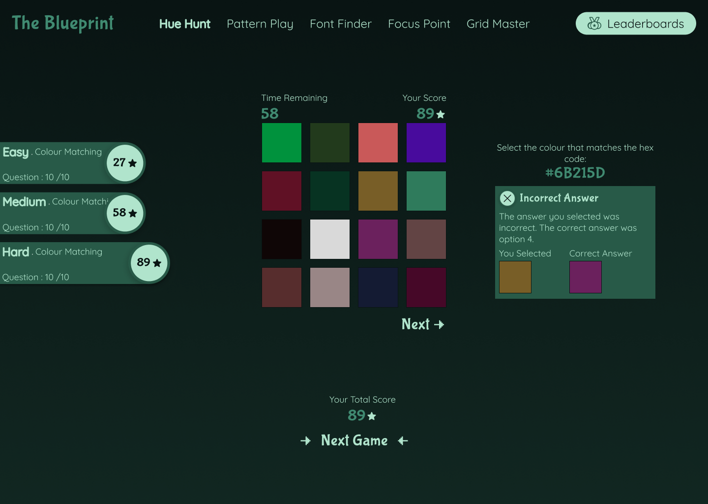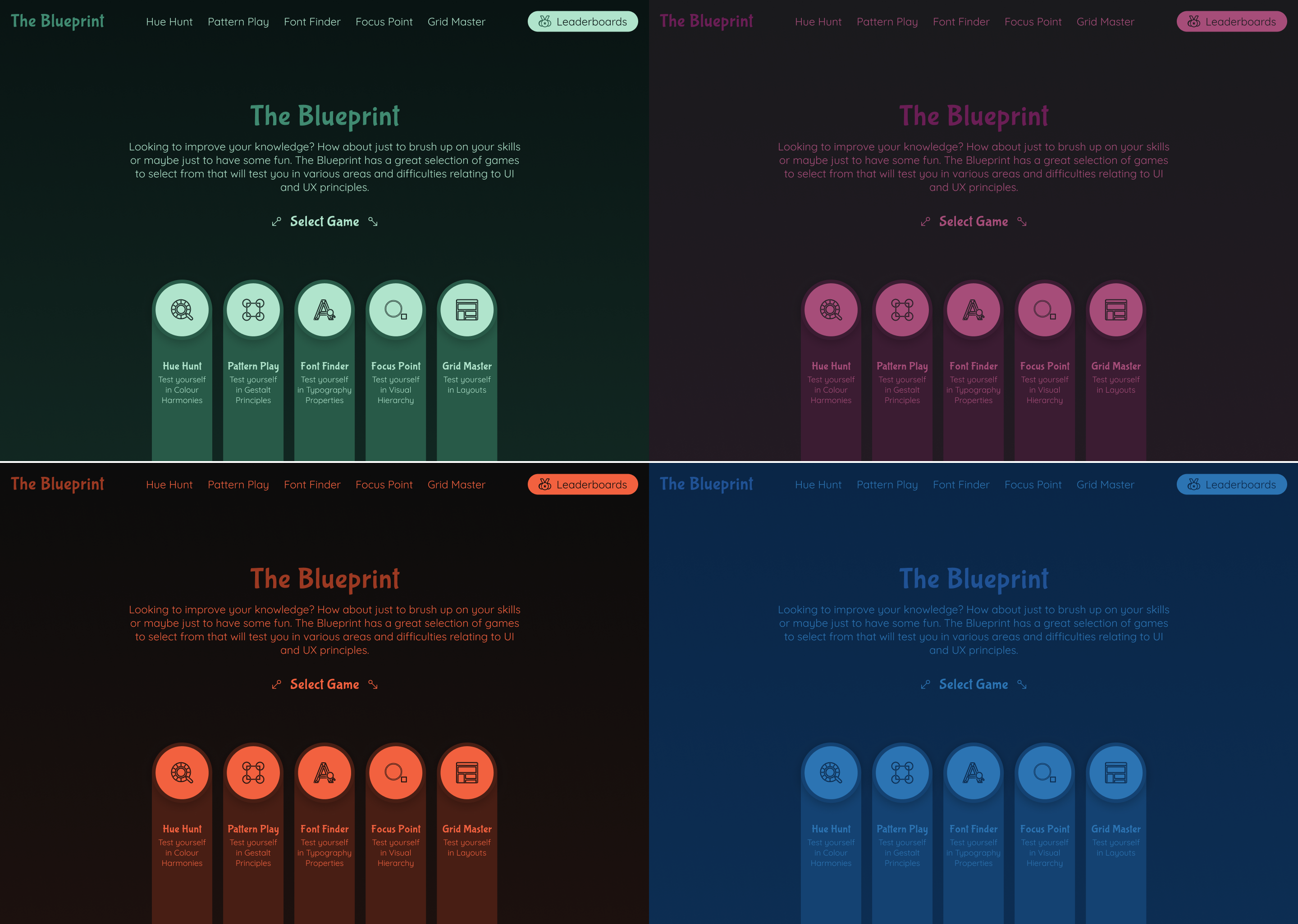 During the discovery phase, multiple colour palettes were explored with a focus on darker tones. This decision served two key purposes: supporting a dark mode interface and ensuring that interactive elements within the games could stand out clearly without visual competition.
